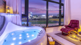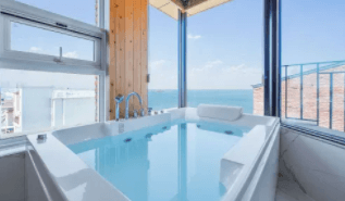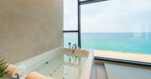 창문 앞에 바로 스파 이용이 가능하기 때문에 멋진 뷰를 바라보며 스파 힐링하기 너무 좋은 숙소입니다. 시설도 전체적으로 깔끔해서 많은 연인 관광객들이 찾는 장소라고 합니다. 근처론 안목해변과 송정 해수욕장이 가깝게 위치하고 있어 관광하기도 좋습니다.
