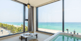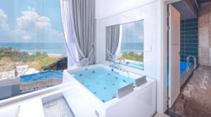 숙소는 독채로 이용이 가능한 4개 객실은 프라이빗한 실내 수영장이 있어서 부담 없이 물놀이를 할수 있는 장점이 있습니다. 내부는 고급스러운 인테리어로 깔끔하게 관리 되어 있고, 바로 앞이 바다이기 때문에 뷰가 아주아름답습니다. 일출을 바로 볼수 있는 장점도 있습니다.